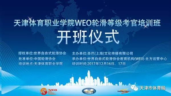2017年12月16日—17日,为推动轮滑运动健康、规范、科学、有序发展,培养轮滑项目技术技能型人才,扩宽学生就业渠道,由世界自由式轮滑协会授权,中国轮滑协会批准,圣巴(上海)文化传播有限公司主办,WEO北方运营中心——行健极远(天津)文化传播有限公司承办的首届高校WEO自由式轮滑等级考官培训班在天津体育职业学院举行。